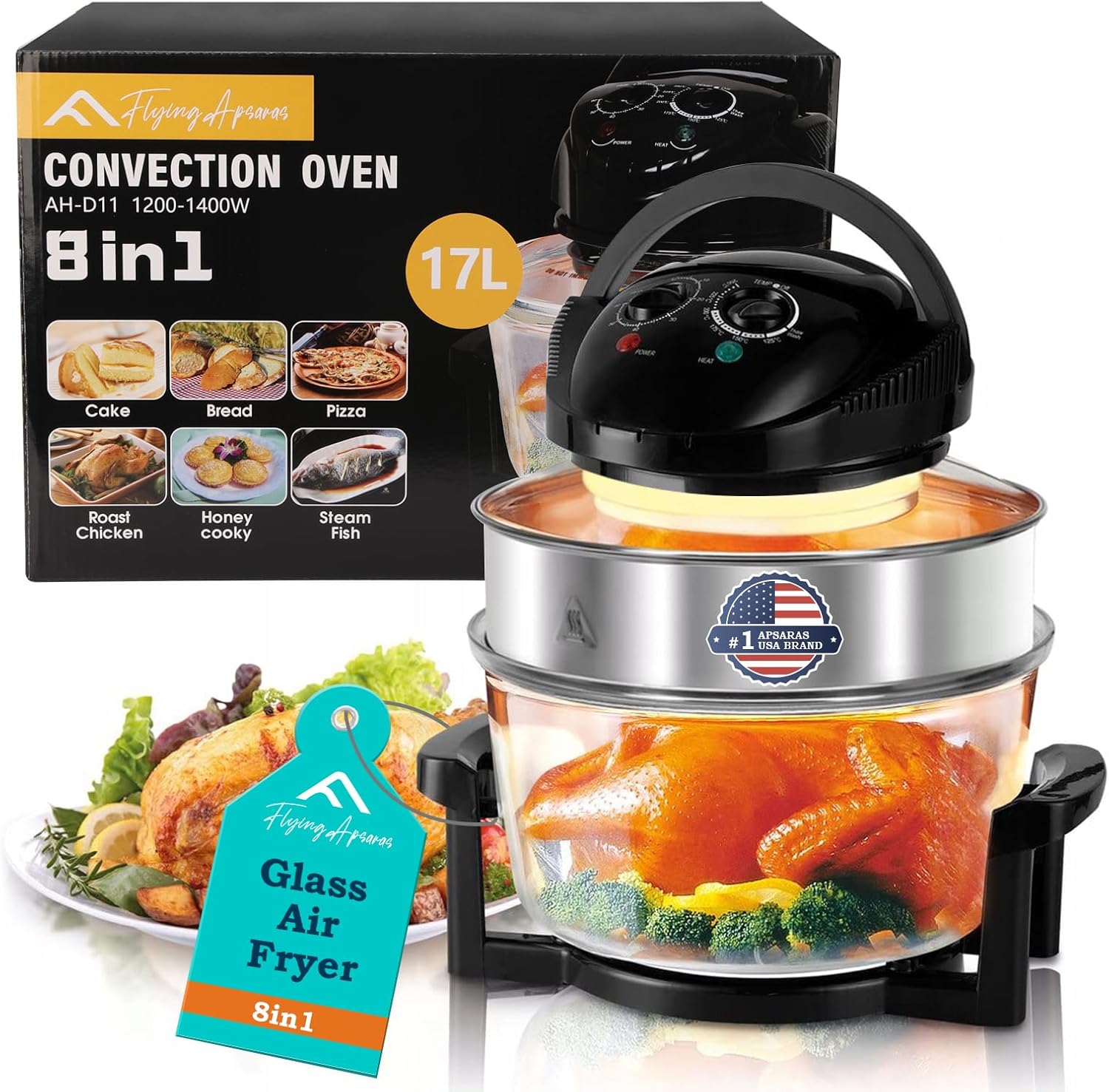 The FLYING APSARAS 8in1 Glass Air Fryer is a non-toxic, 17-quart countertop convection oven with a glass bowl. It’s designed for healthy cooking and can bake, grill, steam, broil, and roast. This appliance comes with a glass bowl, a broil rack, and a toasting rack. It’s like having eight kitchen tools in one!