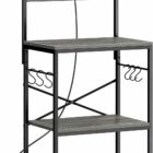 This black ChooChoo farmhouse cabinet works as a coffee bar and a kitchen cabinet. It has a bakers rack style with shelves for storage. It also has power outlets, so you can plug in your microwave or coffee maker. The cabinet has a hutch on top and comes with 6 hooks for hanging things. It has a farmhouse design.