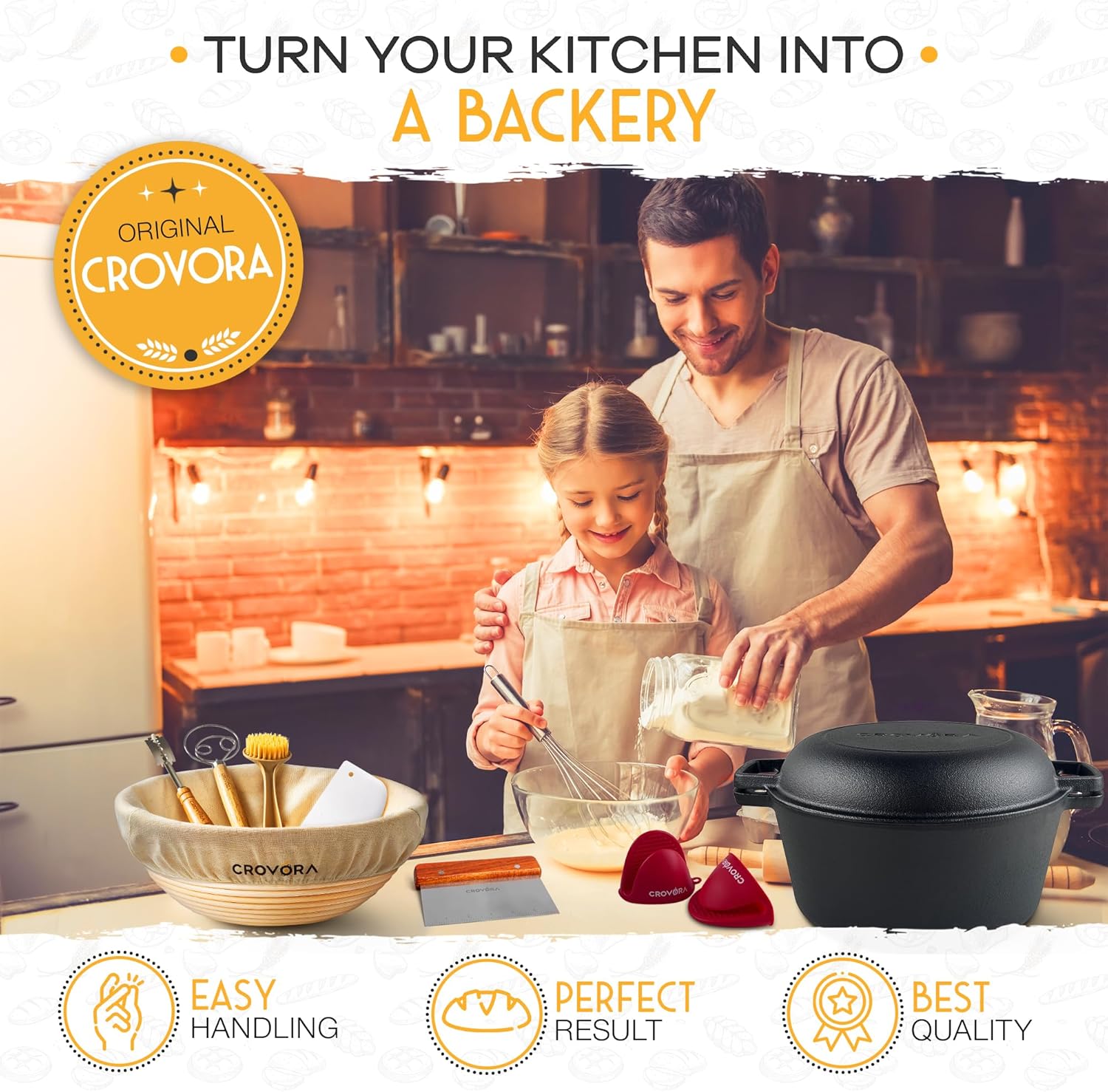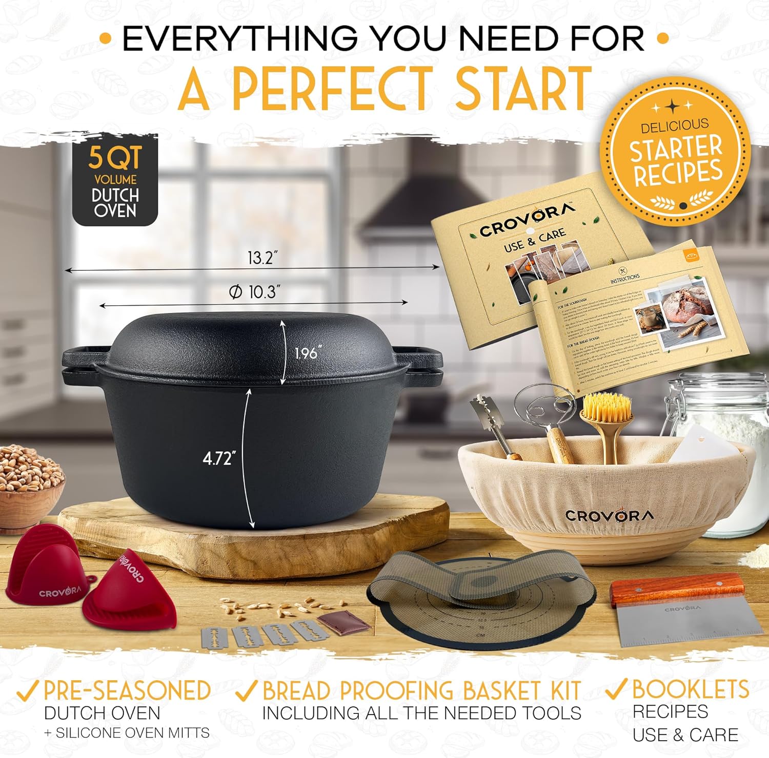 This Crovora 5QT pre-seasoned cast iron Dutch oven is designed for baking bread and comes with helpful sourdough supplies like a banneton proofing basket and a skillet lid. Made of heavy cast iron, it needs to be hand washed and takes time to heat up, potentially causing uneven browning, and its lid handle can get hot. While it requires occasional seasoning and takes up storage, it includes basic instructions and may come with a basic lame. Keep in mind that cast iron items can be pricey. Read more…