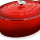 This Crovora set has a 5-quart cast iron pot that’s already seasoned, meaning it’s ready to use for baking bread. It comes with a lid that can also be used as a skillet. If you like making sourdough, this set includes helpful things like a basket for the dough to rise in (banneton), and other supplies. The cast iron helps heat spread evenly so your bread can get a nice, crispy outside. You even get a recipe book to help you get started.