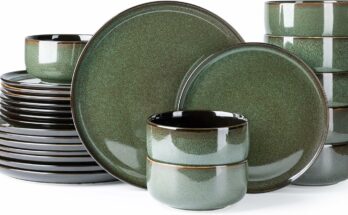 This GBHOME ceramic dinnerware set for eight, made of stoneware with a reactive glaze, is designed to be chip and scratch resistant, as well as safe for the dishwasher, microwave, and oven. The set aims to be durable, stylish, and easy to clean, featuring a lead-free glaze. However, some users have noted that the bowls can be small, the plates large, and the dishes can feel heavy. There are also mentions of potential glaze flaws, uneven stacking, the dishes getting hot in the microwave, and reported issues with durability, scratches appearing, and bowls arriving cracked in some instances. Read more…