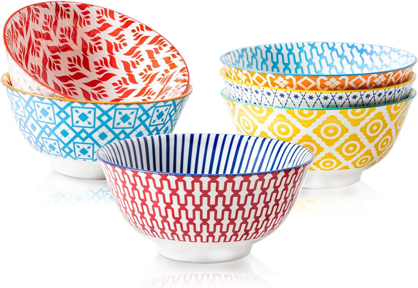 This Gibsimi set has six ceramic bowls. Each bowl can hold 24 ounces of food. They are deep, like cereal bowls, and are about 6 inches wide. These are good-sized bowls for eating meals like pasta, salad, noodles, rice, or even dessert. They are safe to use in the microwave and the dishwasher. The set comes with different colors for the bowls.