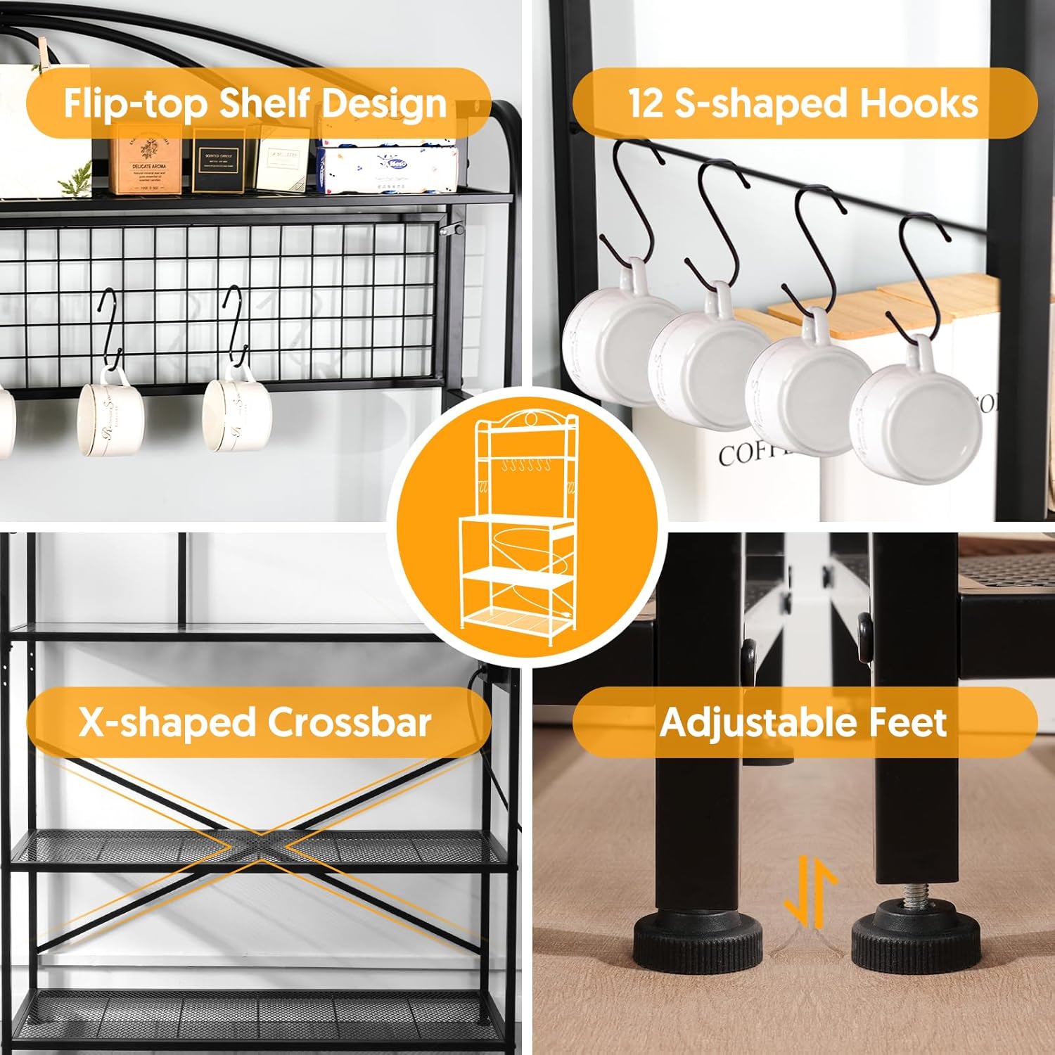The Home Limpidity Large Bakers Rack is a big storage shelf made for kitchens. It’s 33 inches wide and has a “bakers rack” style with five shelves, so you can put lots of things on it, even a microwave. It also works as a coffee bar station and has a power outlet to plug in your coffee maker or other small appliances. Plus, it comes with S-shaped hooks for hanging things. It has a metal frame and a tabletop made of colored glass.