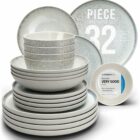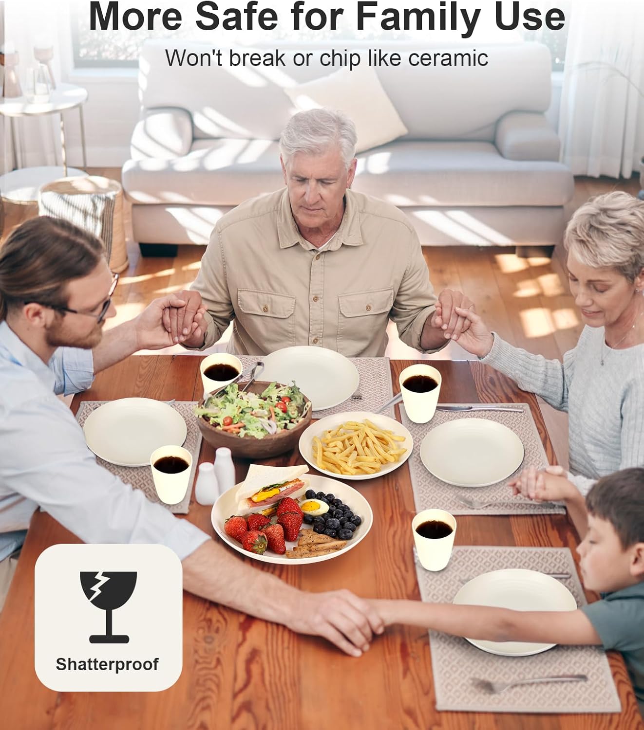 This Quatish 24-piece dinnerware set includes plates, bowls, and cups for six people. Made from unbreakable wheat straw material, these lightweight beige dishes are safe for the dishwasher and microwave, making them suitable for camping, outdoor kitchens, and apartment dining. While durable and kid-friendly, some users might find the bowls and cups small, the overall feel cheap, the material elastic, and the edges potentially sharp, with a possibility of scratching easily and being not very thick or upscale. Read more…