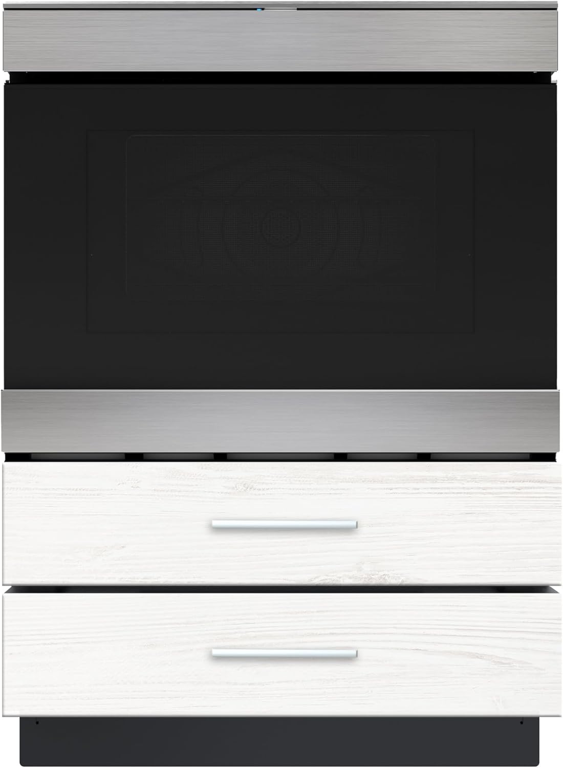 This 24-inch wide Sharp pedestal is made of stainless steel and is designed to go under a counter. It’s for a convection microwave drawer oven. It has two storage drawers that open when you push them. The feet can be adjusted to make it the right height. You can also put custom panels on it to match your kitchen.