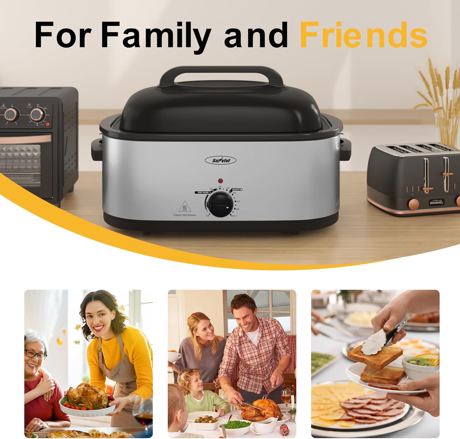 The Sunvivi 24-Quart Electric Roaster Oven is a big oven that can roast a turkey. It has a clear lid so you can see the food cooking. The lid helps the food stay moist. It also comes with a 3 in 1 electric sandwich press. This press has plates that can be taken out and are non-stick. You can use it to make sandwiches. The roaster oven has a pan that you can remove and a rack inside.