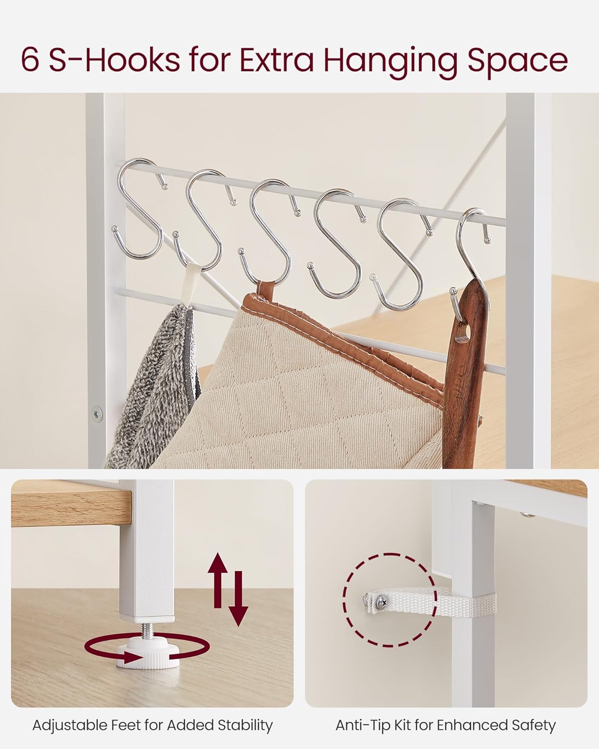 This VASAGLE baker’s rack in golden oak and cloud white gives you extra space in your kitchen. It can hold your microwave, spices, pots, and pans on its shelves. It also has a wire basket and six hooks to hang things. This helps keep your kitchen tidy and makes it easier to find what you need. It looks nice too!